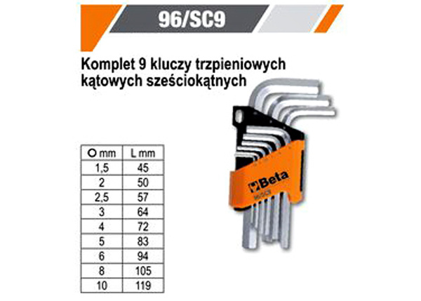 BETA Zestaw 9 kluczy kątowych IMBUSOWYCH CHROMOWANYCH 96/SC9