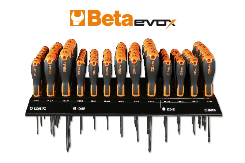 • Wkrętak krzyżowy profil Pozidriv®-Supadriv®, chromowany, końcówka czerniona BETA EVOX 1209E/PZ2