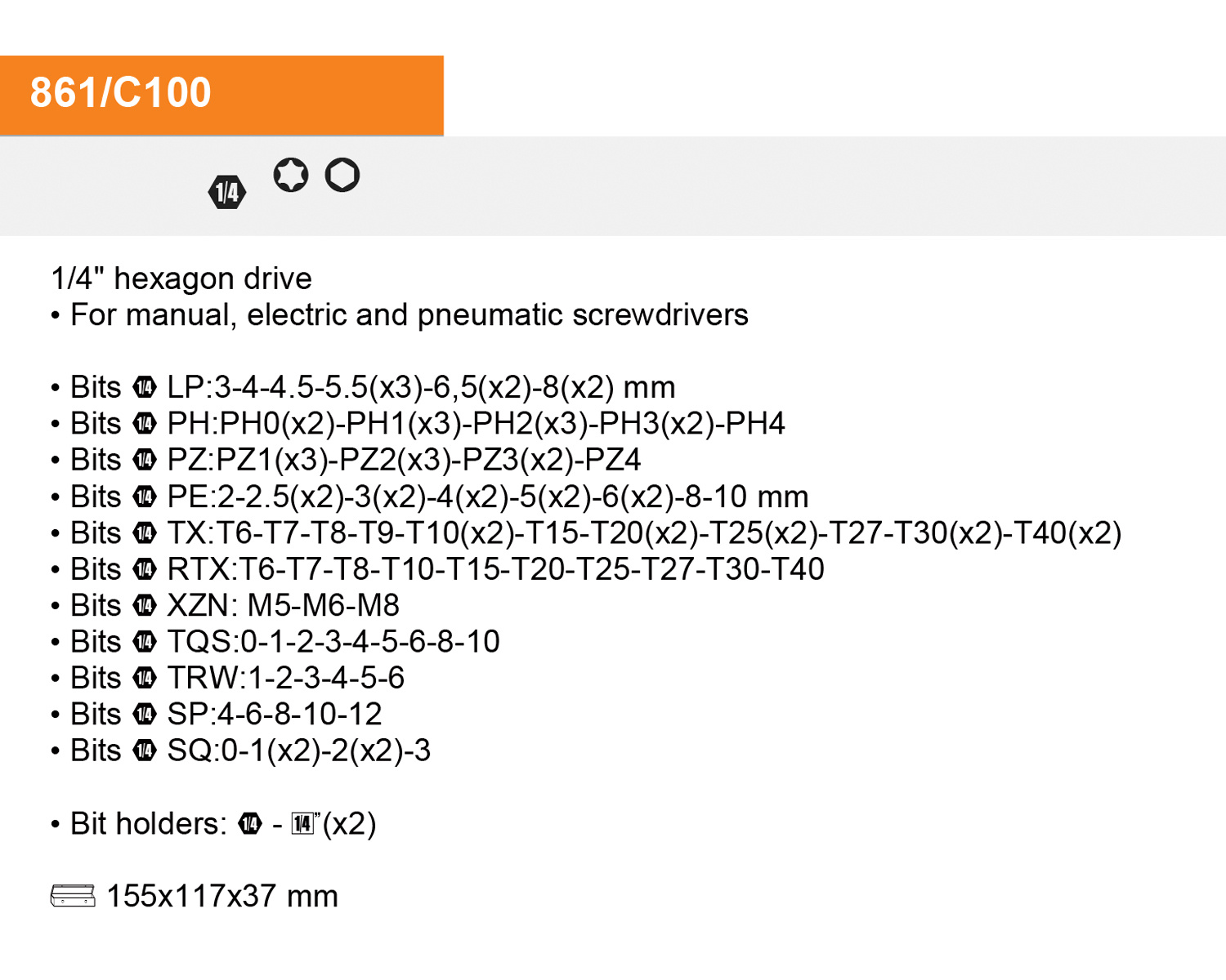- Końcówki wkrętakowe PE: 2, 2.5 (x2), 3 (x2), 4 (x2), 5 (x2), 6 (x2), 8, 10 mm