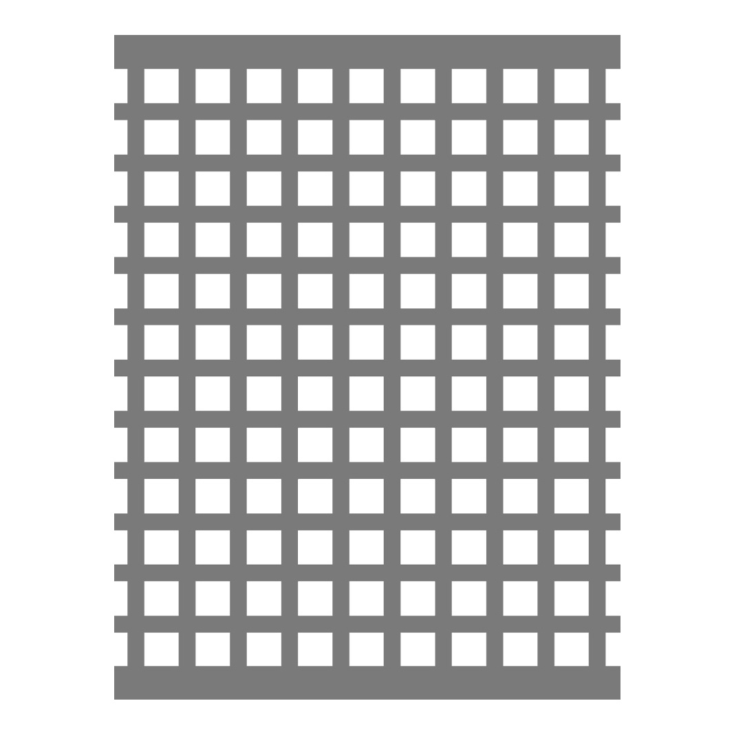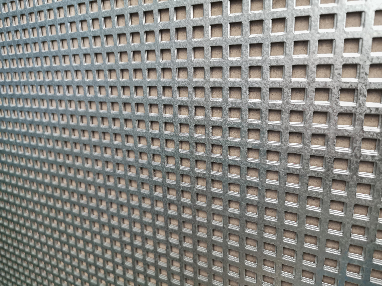 - Blacha perforowana ocynkowana (ocynk ogniowy srebrny) z oczkami kwadratowymi w układzie prostym.