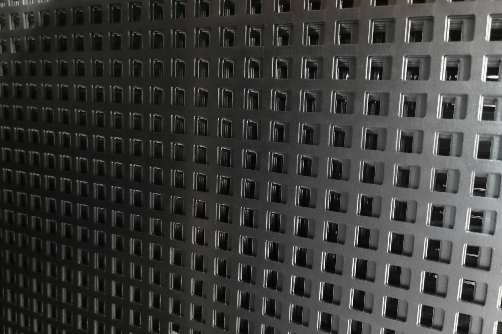 - Blacha perforowana stalowa (surowa) z oczkami kwadratowymi w układzie prostym.