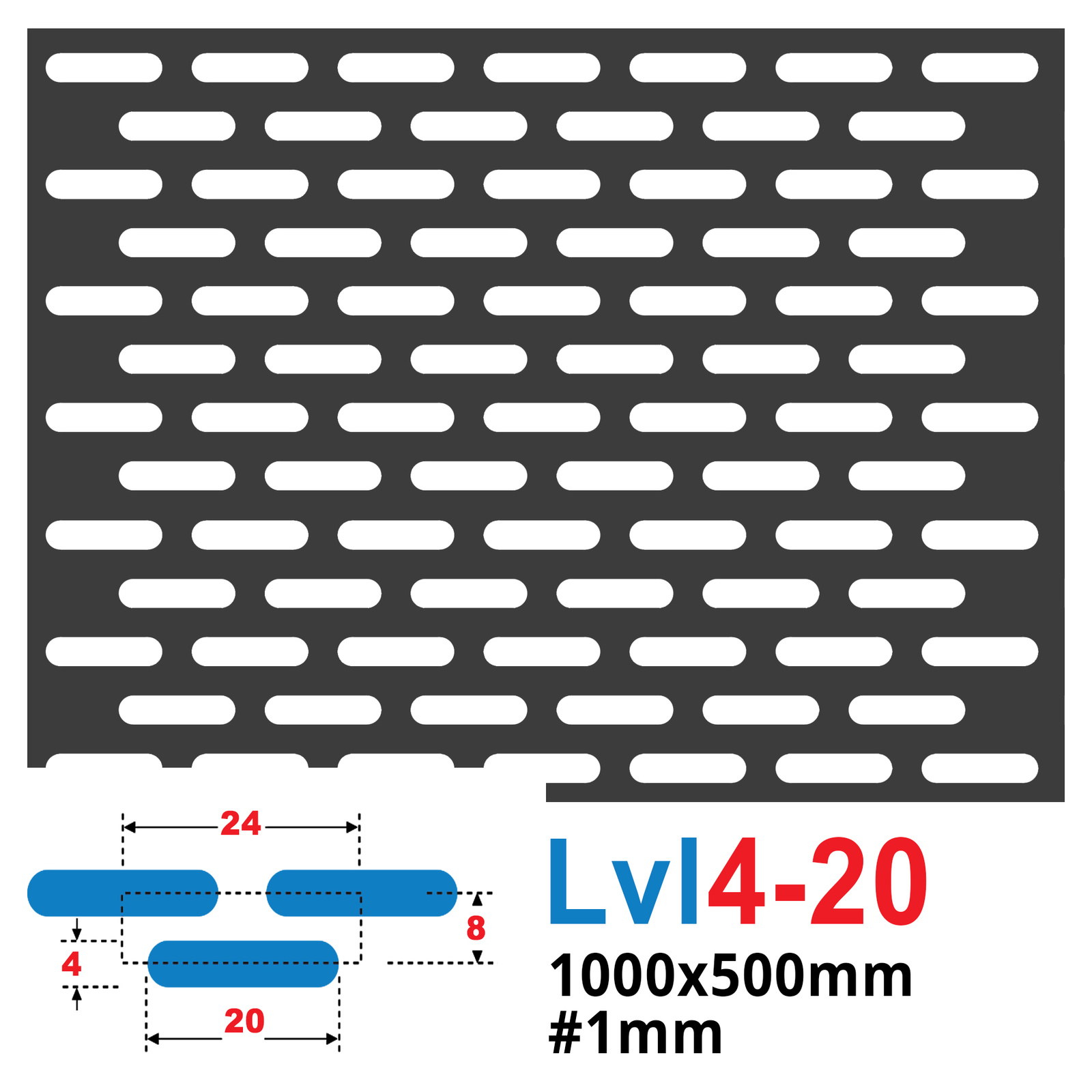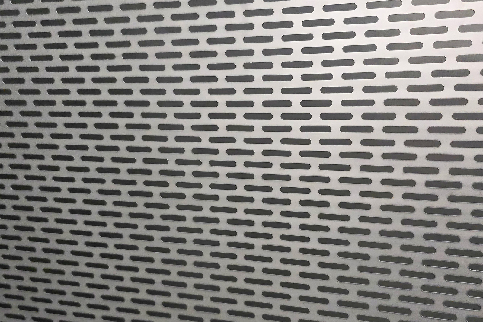 - Blacha perforowana stalowa (surowa) z oczkami podłużnymi w układzie mijanym.