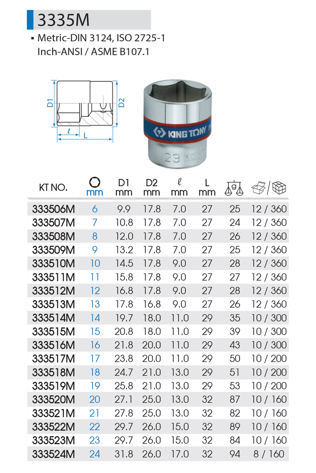 KING TONY Klucz nasadka KRÓTKA 3/8" 6-KĄTNA 14 x 29 mm