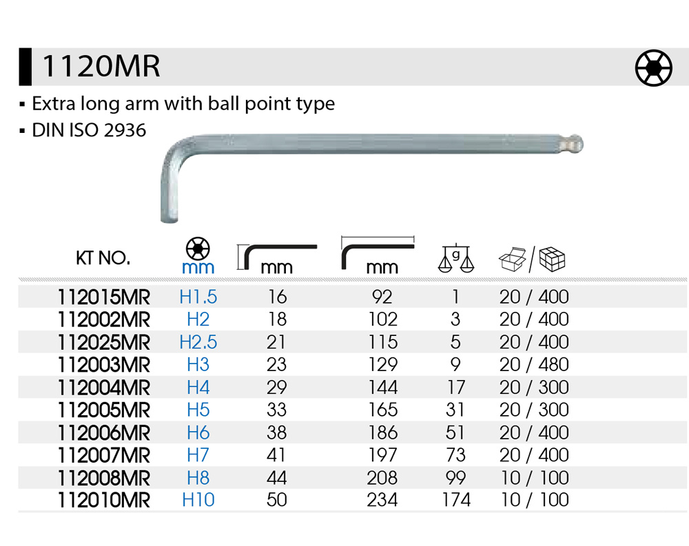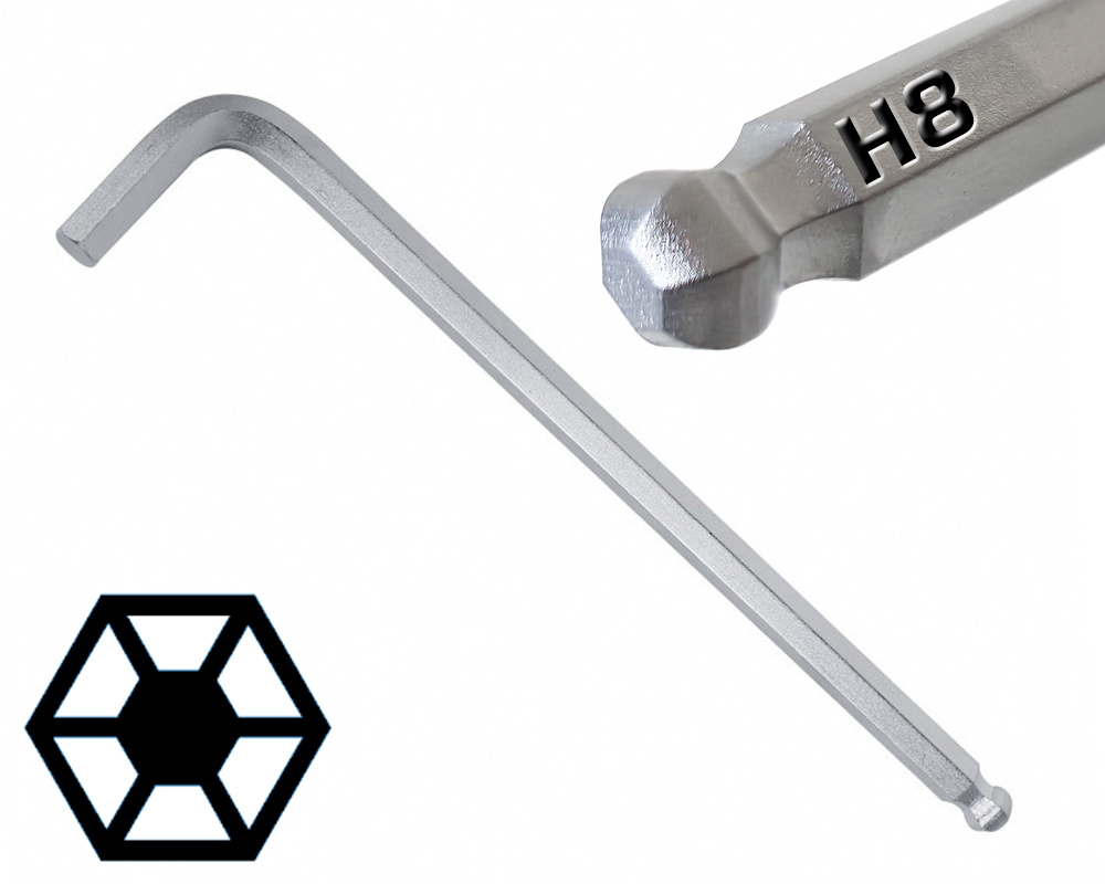 - Klucz trzpieniowy, kątowy typu "L", ekstra długi z kulką, metryczny z końcówką IMBUSOWĄ w rozmiarze H8 o długości całkowitej 208 mm