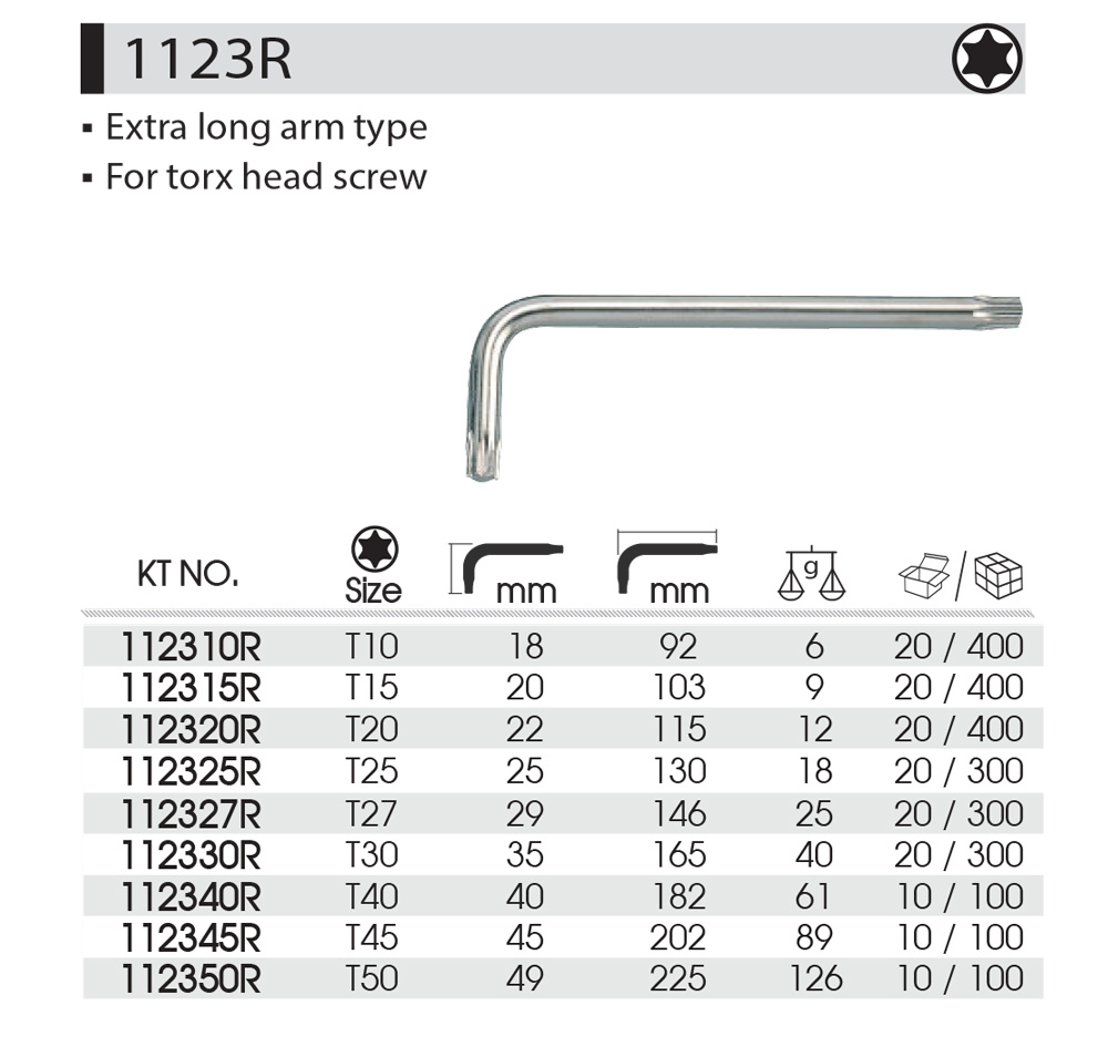 - Klucz trzpieniowy, kątowy typu "L", ekstra długi, z końcówką TORX w rozmiarze T15 o długości całkowitej 103 mm