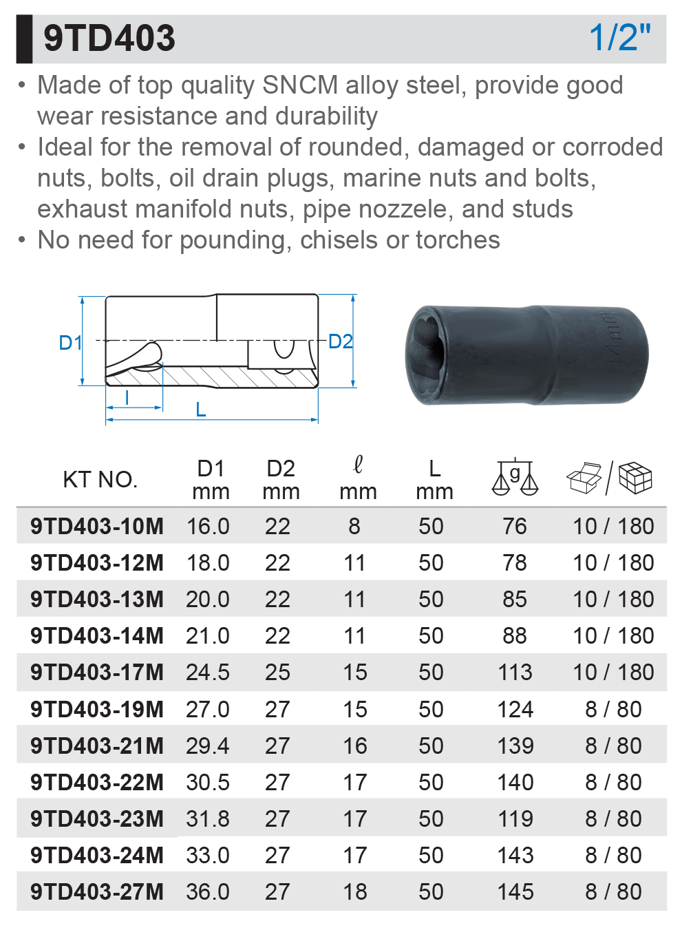 - Przeznaczona do usuwania zaokrąglonych, uszkodzonych lub skorodowanych nakrętek, śrub, korków spustowych oleju, nakrętek kolektorów wydechowych, dysz rur oraz szpilek.