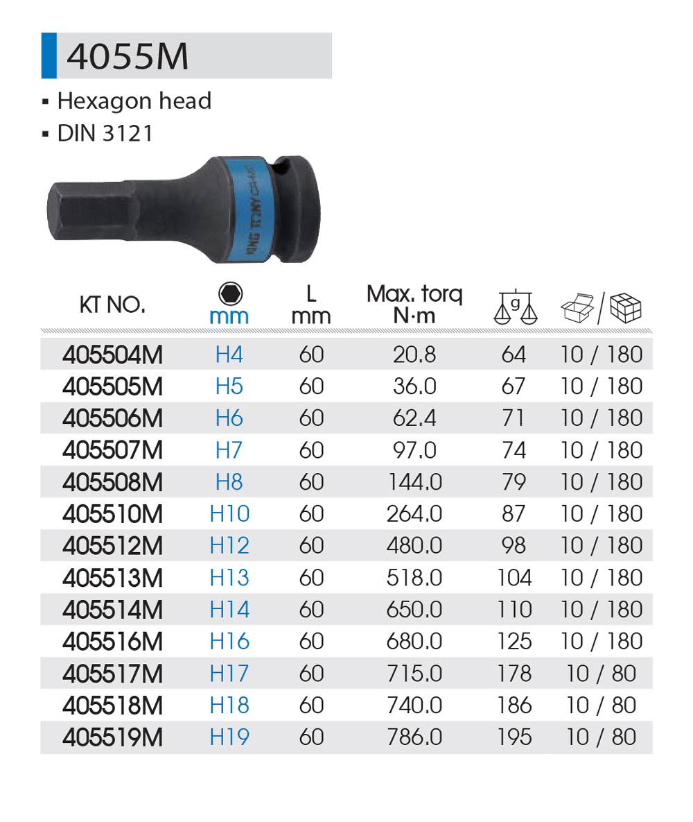 - Nasadka UDAROWA 1/2" ze stali Cr-Mo z końcówką IMBUS HEX H10 x i długości całkowitej 60 mm.