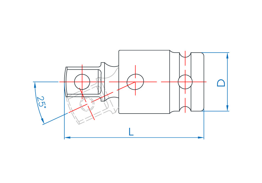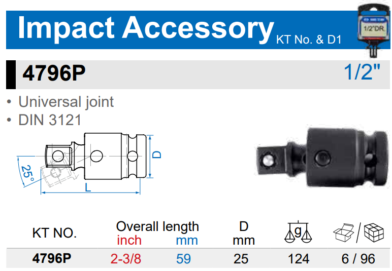 • Przegub udarowy kulisty 1/2" o długości całkowitej 59 mm