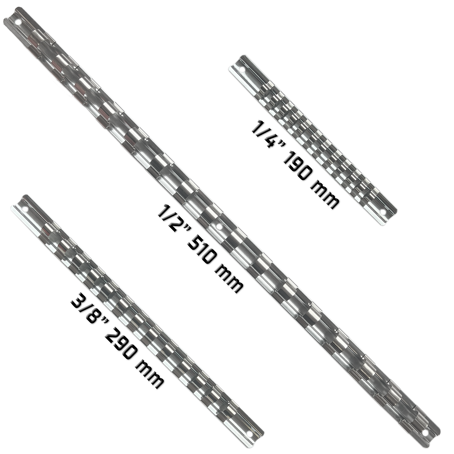 - Szyna o długości całkowitej 290 mm z 13 uchwytami na nasadki 3/8", posiada możliwość przymocowania do ściany