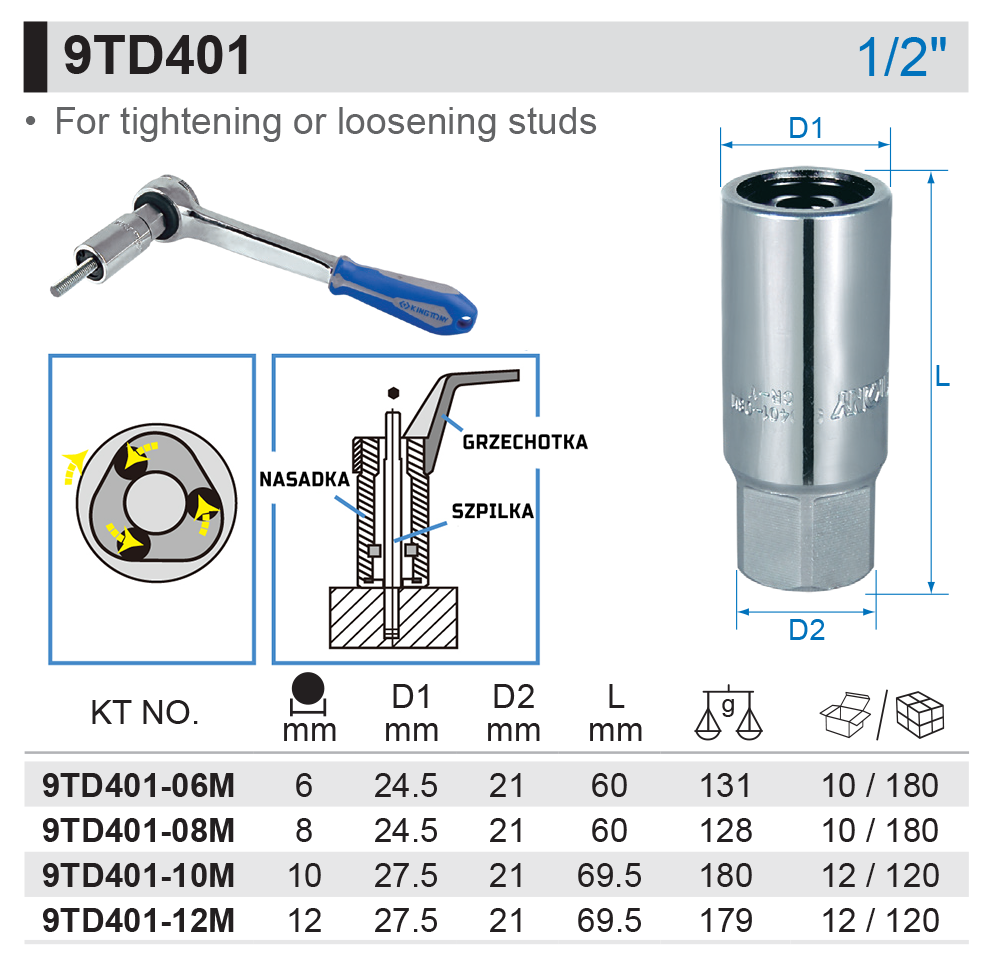 • KING TONY WYKRĘTAK ROLKOWY o rozmiarze M12 przeznaczona do wkręcania i odkręcania szpilek, obsługiwana kluczem 21 lub grzechotką 1/2" o długości całkowitej 69,5 mm