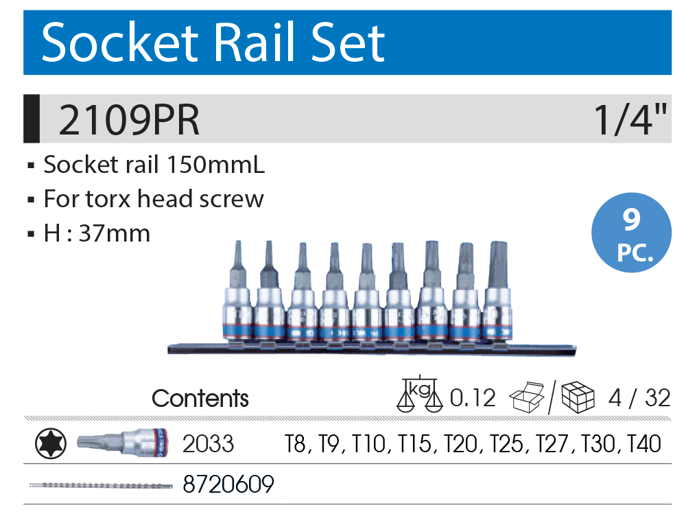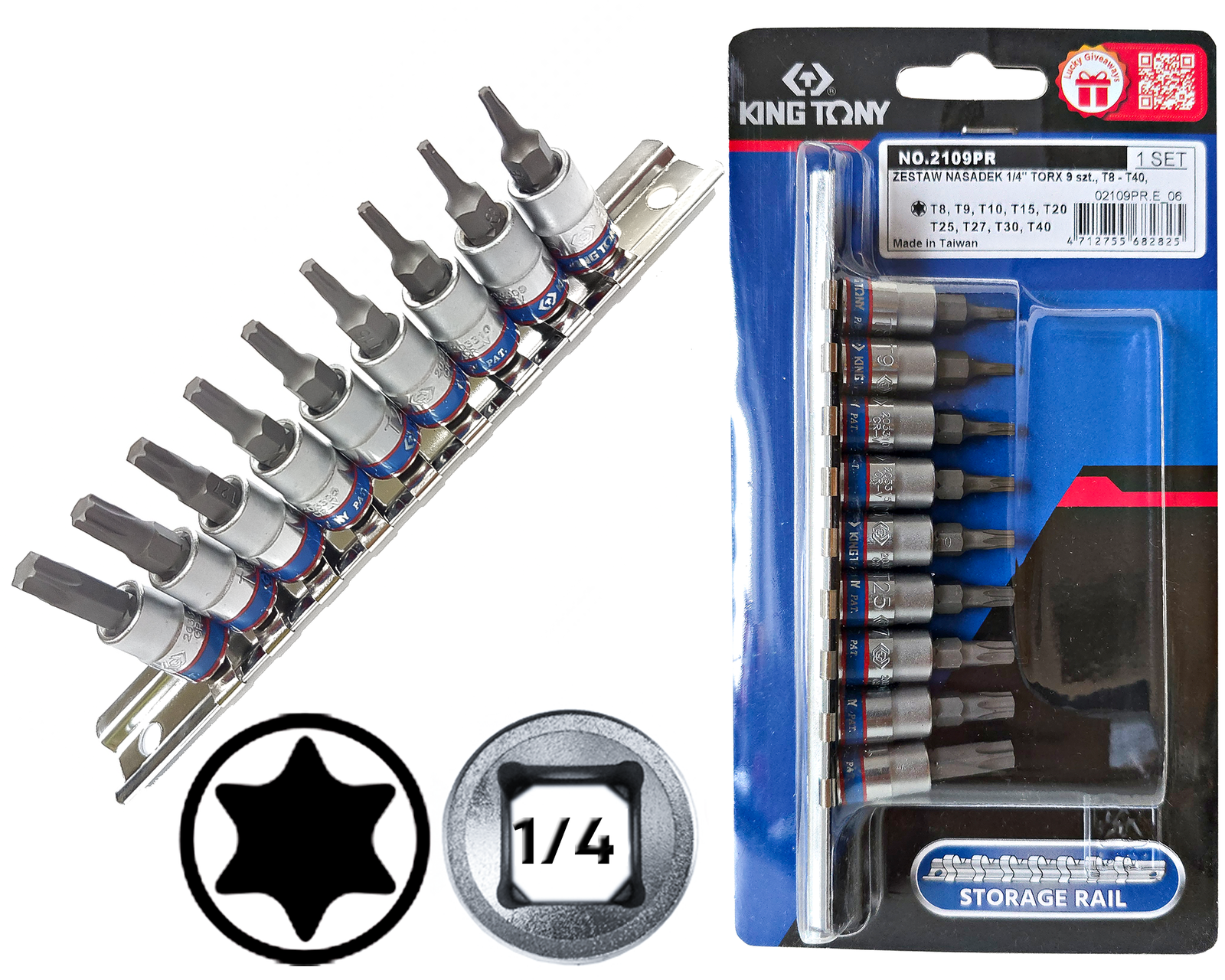 KING TONY Zestaw nasadek z końcówką TORX 1/4" 9 el. T8 - T40 na szynie 2109PR